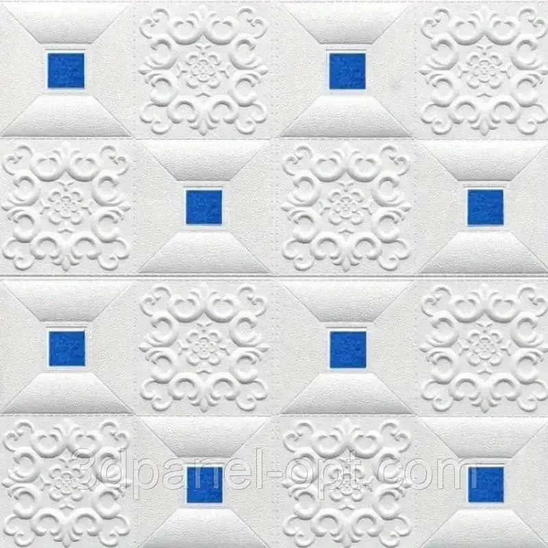 Самоклеюча 3D панель для стін і стелі Фігури з блакитними квадратами 700×700×4 мм — біла